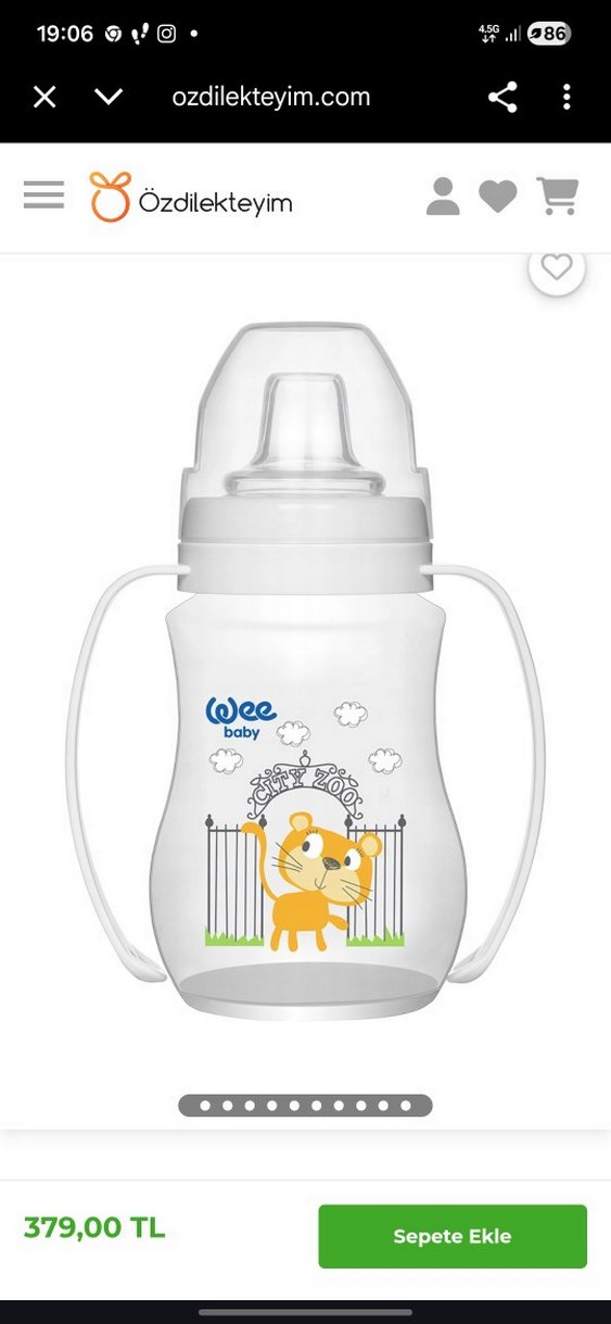 Beyaz renkli, 6 ay ve üzeri bebekler için uygun, tutması kolay iki kulplu biberon. Pastel tonlarda sevimli hayvan figürleri bulunur. sıfır kutu