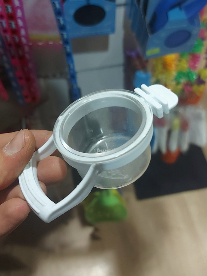 Beyaz renkte, tutma sapı ve kilitli kapağı olan şeffaf bebek biberonu. Kullanımı ve tutuşu kolaydır.