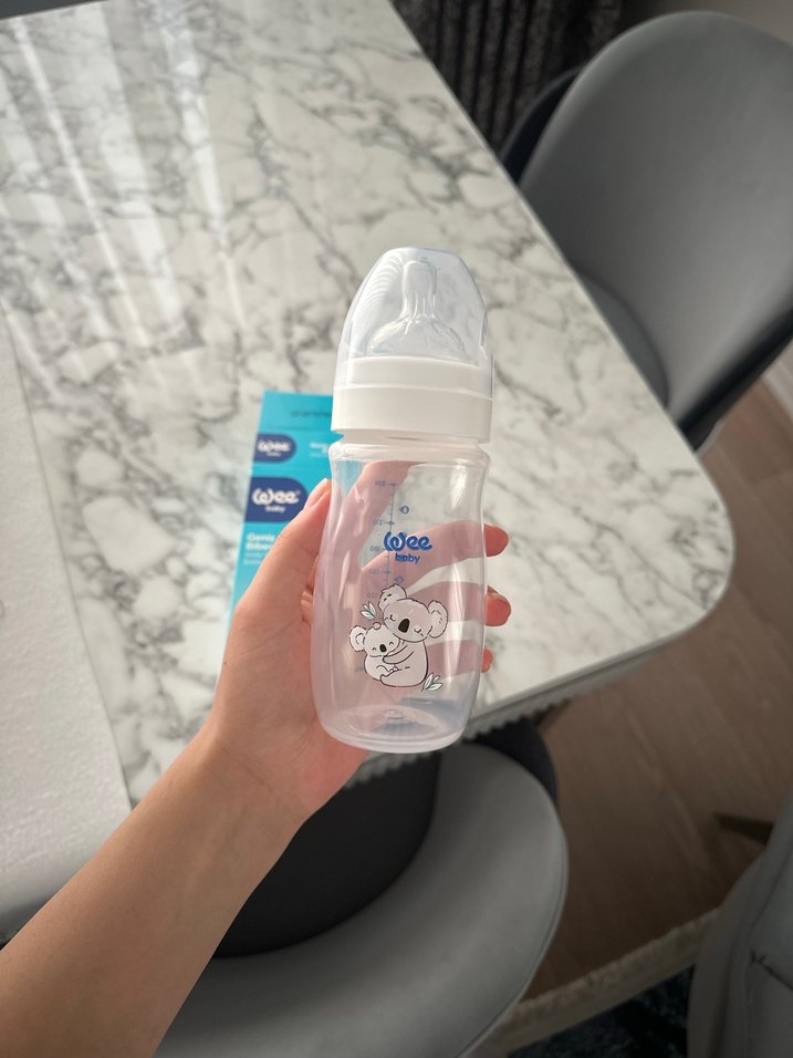 Beyaz renkte, pastel tasarımlı ve sevimli koala figürlü bebek biberonu, yumuşak emzikli besleme için uygundur.