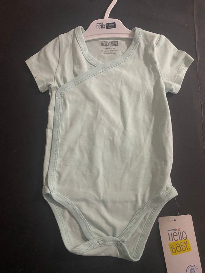Beyaz renkte, kısa kollu ve yuvarlak yakalı bebek erkek body. Yumuşak pamuk kumaştan yapılmış, "Hello, BaBY." yazılı sade normcore tarzda bir model.