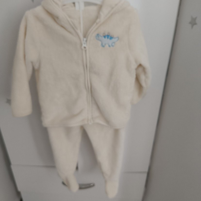 Pastel beyaz renkte, fermuarlı ve yumuşak, sıcak kumaşlı bebek erkek tulumu. Küçük dinozor detayı bulunur.