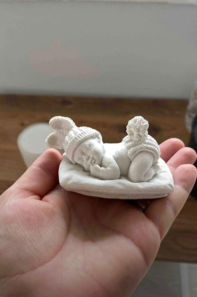 Beyaz renkte, kulaklı şapka takan uyuyan bebek figürlü dekoratif süs, yumuşak bir yastık üzerinde dinleniyor. Pastel tonlar ürüne yumuşaklık katıyor. mum sabun veya taş tozundan yapılabilir. adet çoğalırsa fiyat düşer