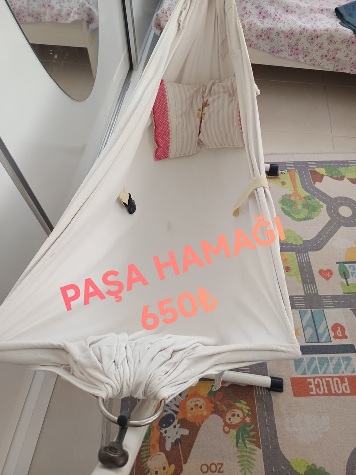 Yumuşak kumaşlı beyaz bebek hamak beşiği, çizgili yastıkla birlikte. Portatif ve sökülebilirdir. Pikniğe, tatile, denize, götürüp güvenle çocuğunuzu yatırabilirsiniz. Çok kullanışlıdır. Benim çocuğum hep onda uyurdu uykusu gelince. O da, biz de rahat ettik. Bir tarafının tahtası kumaşın kenarından çıkıyor. Diktirmek lazım. Alan kişi böyle de kullanabilir, tahtayı takıp dikerse de kullanabilir. Yıkamak için çıkardık. Takmayı beceremedik biz.
