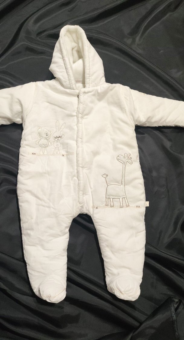 Kürklü detaylı, renkli nakışlı hayvan desenlerine sahip beyaz bebek kız tulumu, kesikli yaka ve kapüşonlu.İngiltereden kızıma hediye geldi.Sadece 1 defa kullanabildim.Hava sıcak olduğu için.