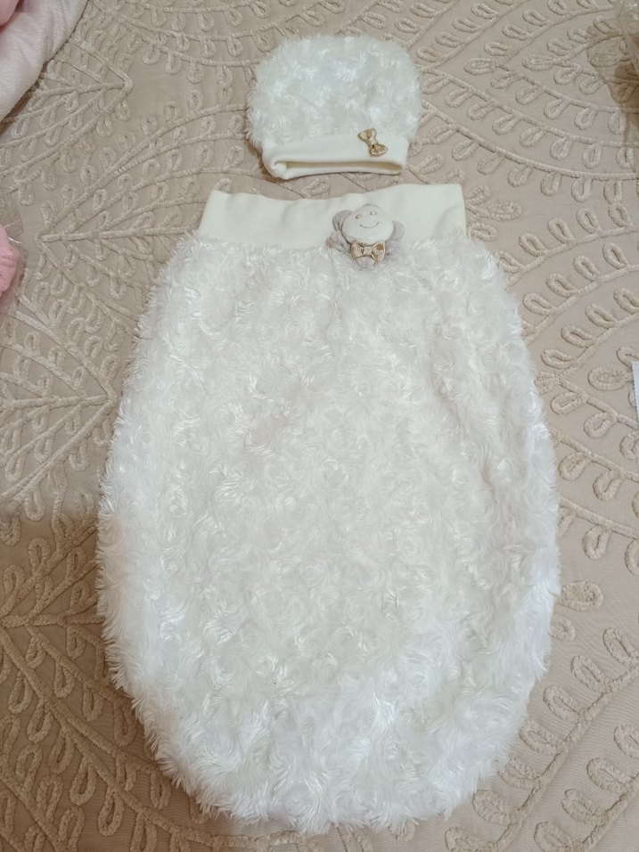 Yumuşak ve sıcak beyaz bebek kundak ve uyumlu bere seti, bebekleri rahat tutmak için ideal.