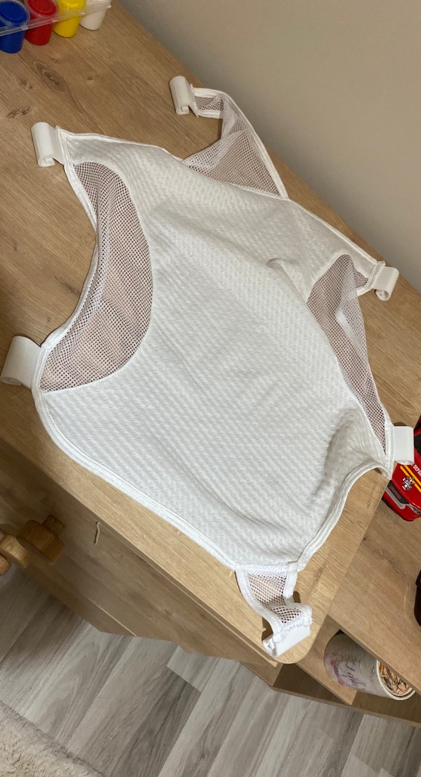 Nefes alabilir file panelleri ve ayarlanabilir kayışlara sahip beyaz bebek taşıma askısı. Hafif ve yumuşak kumaştan üretilmiştir.