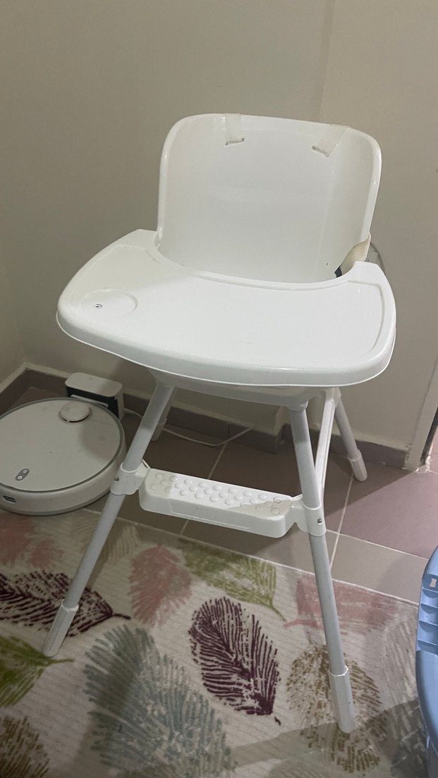 Geniş tepsili beyaz bebek mama sandalyesi, kolay temizlenir ve konforludur. Ayak destekli emniyet kemerli. E bebekten alındı.