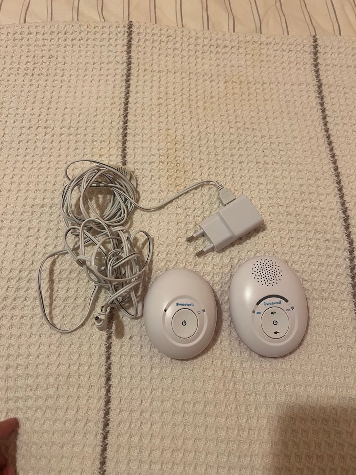 Gri detaylı beyaz bebek monitörü ve kamera seti, şarj cihazı ve kablolu bağlantı ile. Kompakt tasarım kolay kullanım sağlar.