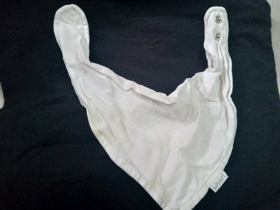 Yumuşak kumaştan yapılmış, düz beyaz bebek önlüğü, beslenme sırasında bebekleri temiz tutar.