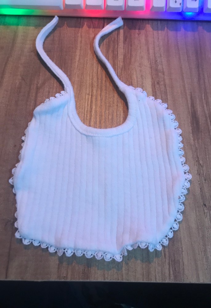 Yumuşak dokulu beyaz bebek önlüğü, kenarlarında narin dantel detayı bulunur. Boyundan bağlanır, bebeklerin temiz kalmasını sağlar.