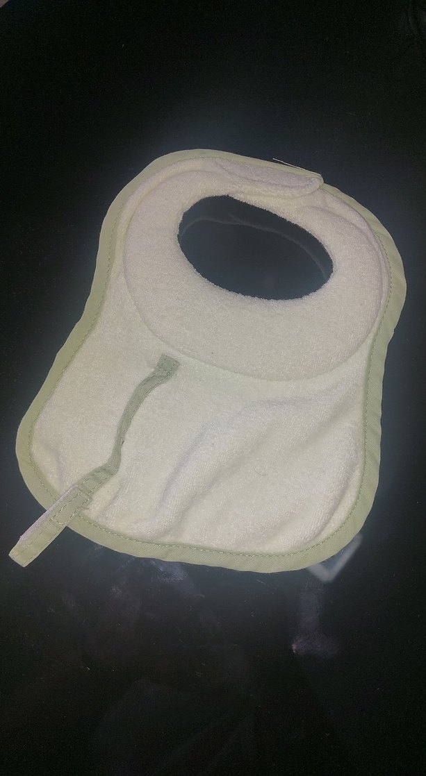 Beyaz yumuşak kumaştan yapılmış, gri kenarlıklı ve desensiz bebek önlüğü. Boyun çevresinde rahat bir kapanışı vardır.
