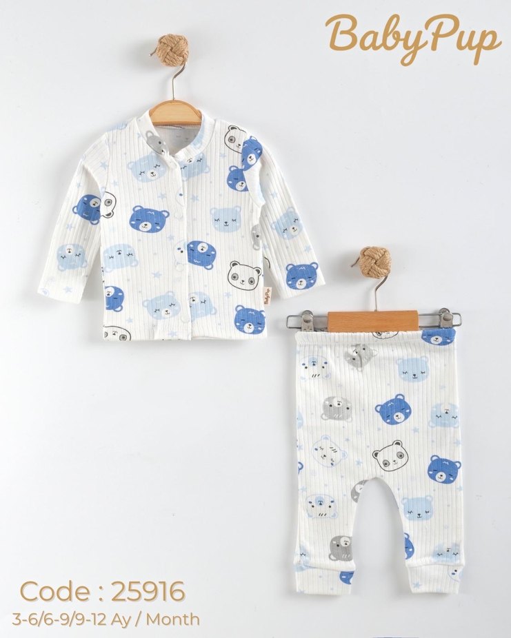 Uzun kollu, yuvarlak yaka, pamuklu ve örme dokulu beyaz bebek erkek takımı, ayıcık desenli, 3-6 6-9 9-12 ay arası bedenlerde.