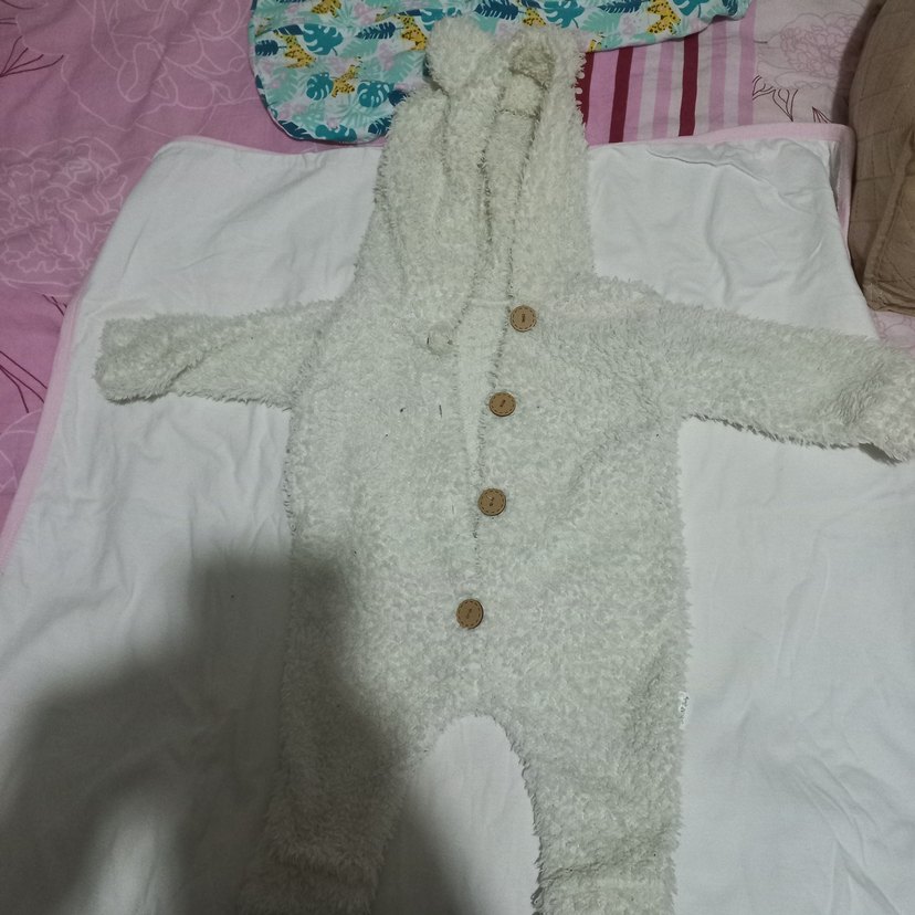 Beyaz renkte, peluş kumaştan yapılmış kapüşonlu bebek tulumu. Ahşap düğmeli, normcore tarzında rahat bir model. 0-1yasa kadar kullanilabilir