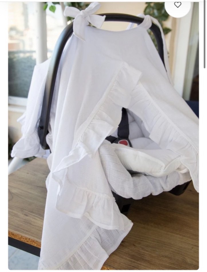 Bebek için beyaz, fırfırlı kenarlara sahip oto koltuğu örtüsü. Seyahat sırasında gölge ve konfor sağlar. Yumuşak kumaşla nazik koruma sunar.