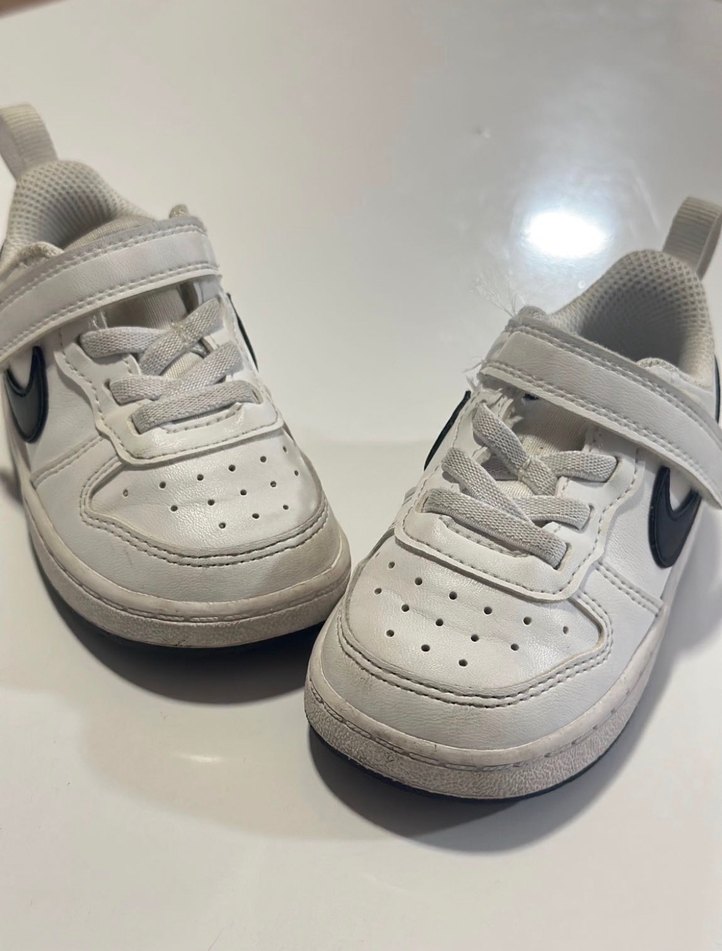 Beyaz bebek spor ayakkabısı, Velcro bantlı ve kauçuk tabanlıdır. Düz ve desen içermeyen gri detaylara sahiptir.