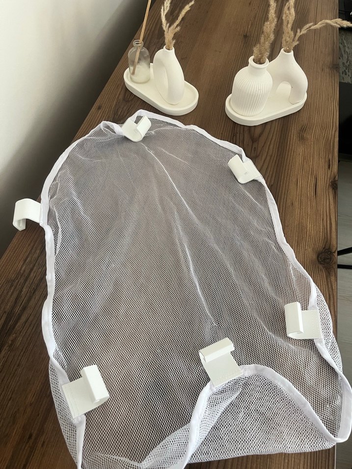Nefes alabilen file kumaştan beyaz bebek taşıma filesi, kolay tutturma için sağlam klipslere sahip. Bebek banyo filesi hiç kullanılmadı.