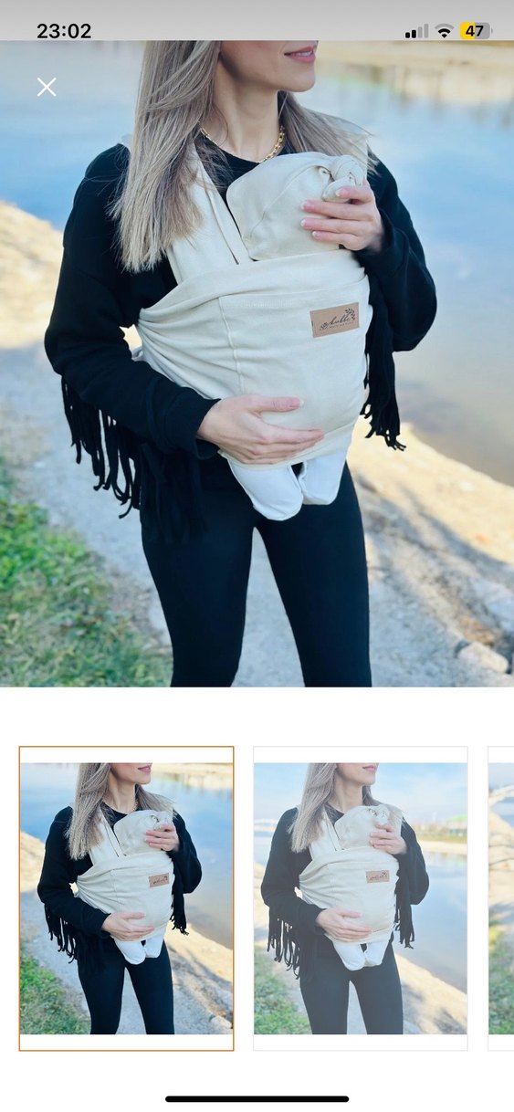 Yumuşak ve geniş beyaz kumaştan yapılmış, bebeği rahat taşımak için arkada bağlanan bebek slingidir.