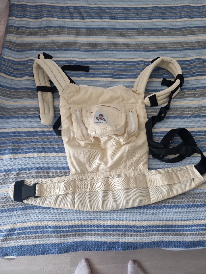 Yumuşak dolgulu askıları ve ayarlanabilir tokaları olan beyaz bebek taşıyıcı. Hafif renk, günlük kullanım için uygun. En cok tercih edilen marka ergonomik vs.