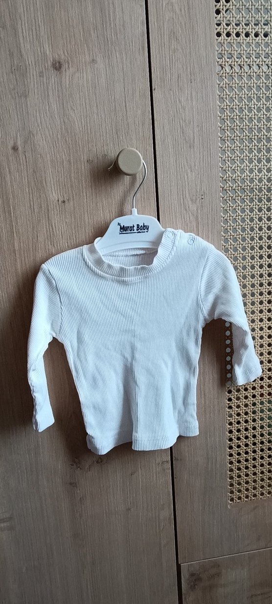 Yumuşak, ince çizgili kumaştan yapılmış beyaz uzun kollu bebek atlet. Kolay giyim için omuzda düğme detayı bulunur.