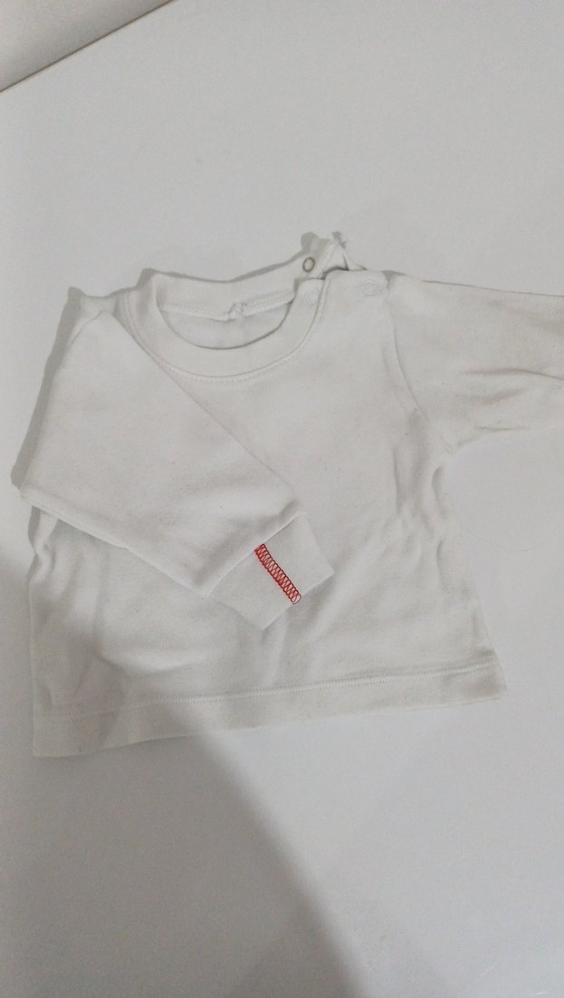 Yumuşak dokulu, sade tasarımlı beyaz uzun kollu bebek içliği. Kolunda küçük kırmızı detay ve omuzda kolay giydirme için düğme bulunur.