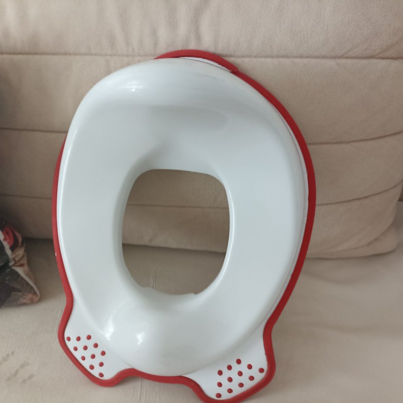 Bebeklerin ilk adımlarında rahatlık ve destek sağlayan beyaz oturak, renkli kırmızı kenarlıklıdır.