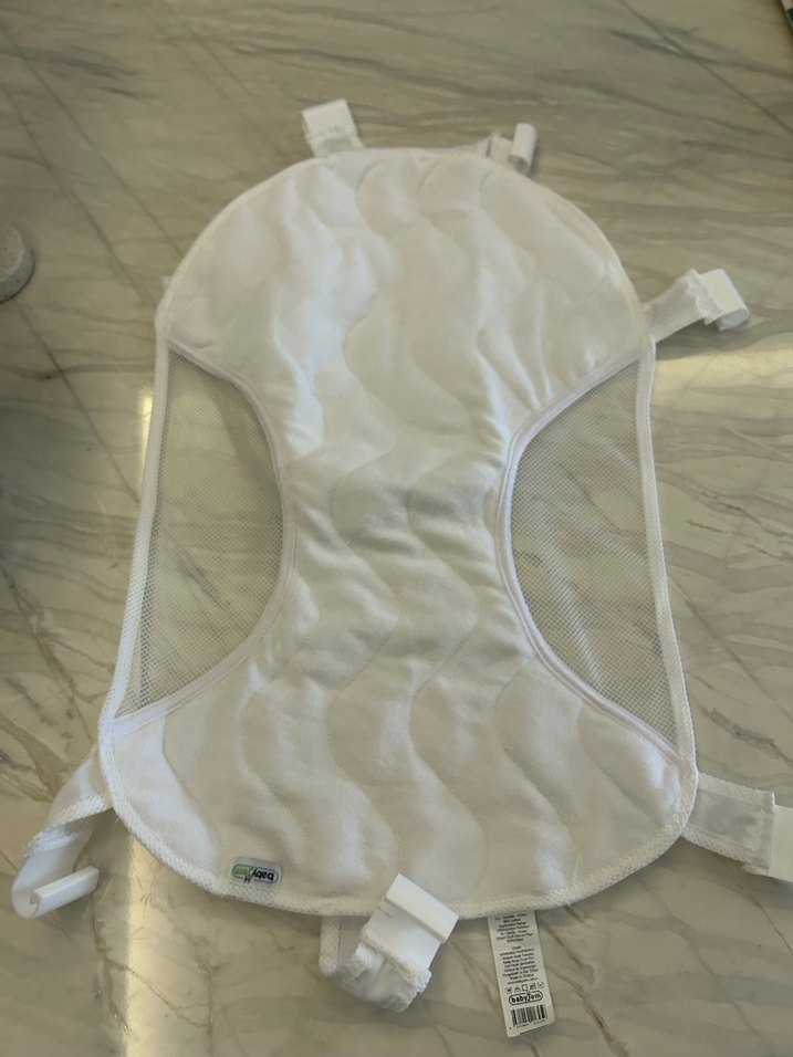 Nefes alabilir file yanlara ve ayarlanabilir kayışlara sahip açık beyaz bebek taşıma askısı.