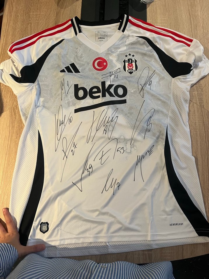 Beyaz, pamuklu, kısa kollu erkek forması. Önünde çoklu imzalar ve baskılı desenler bulunur. Beko yazısı ve dantel detayı vardır. Spor için uygun, rahat kesim.