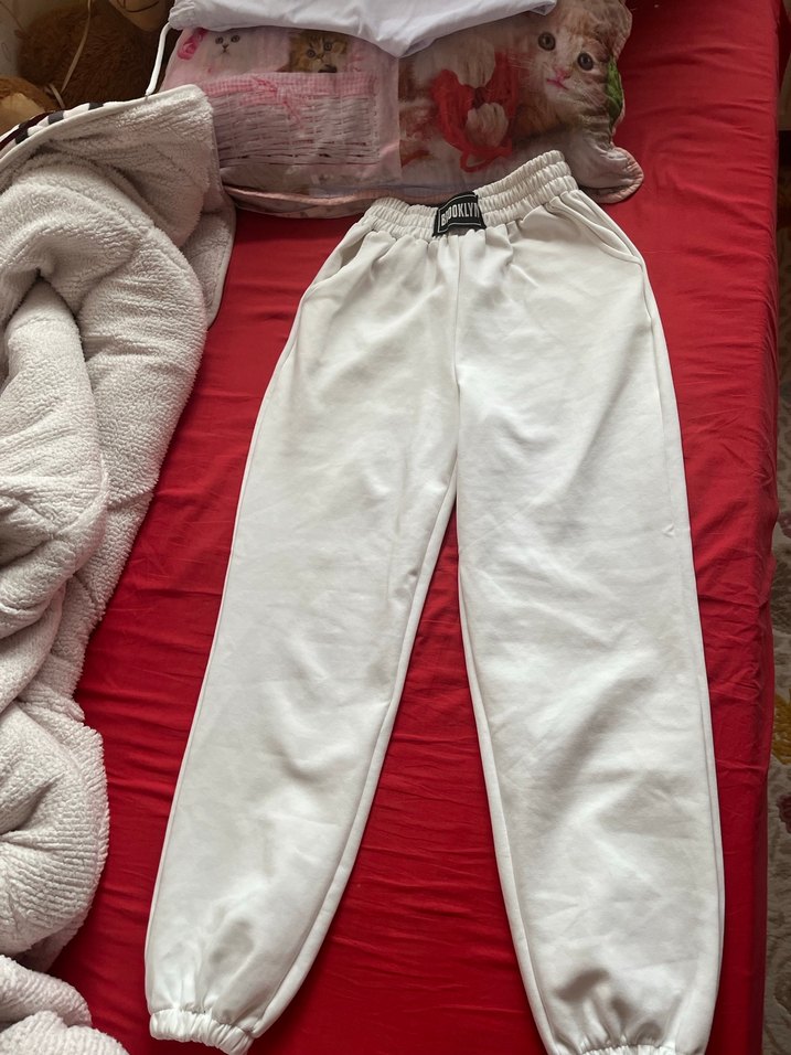 Beyaz, bel bantlı, bol kesim, normal boyda kadın eşofman altı, yumuşak sentetik kumaştan üretilmiştir. Rahat ve günlük kullanıma uygundur.
