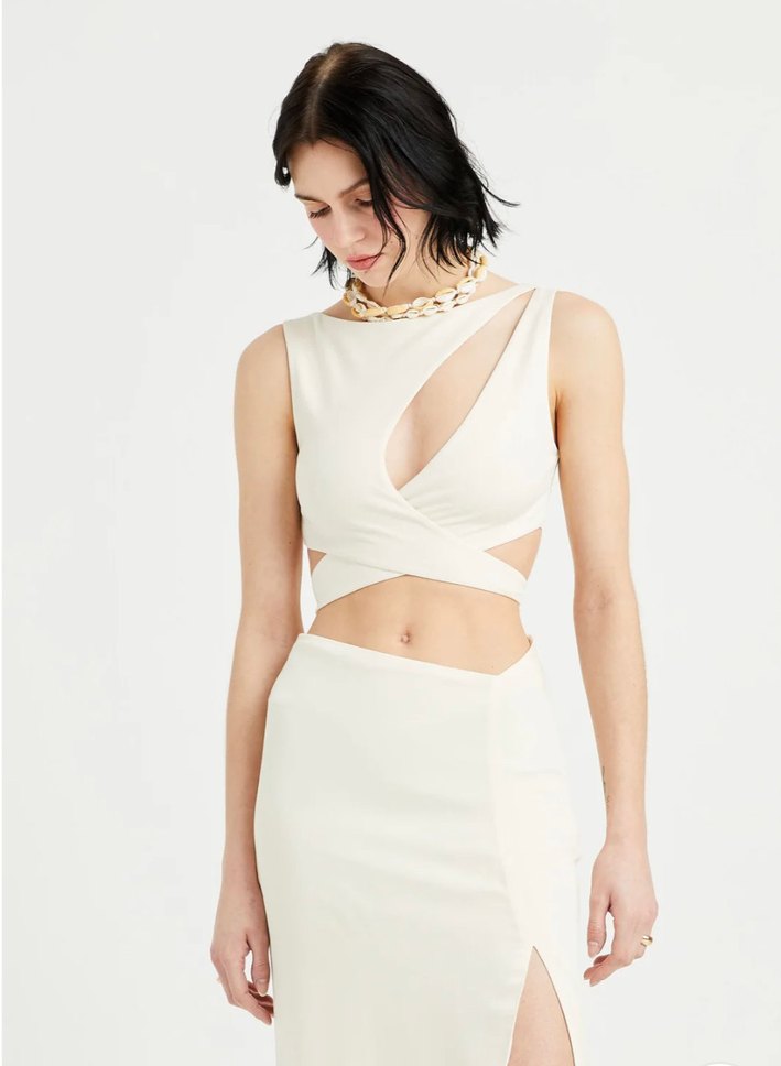 Beyaz dekolteli belden bağlamalı crop