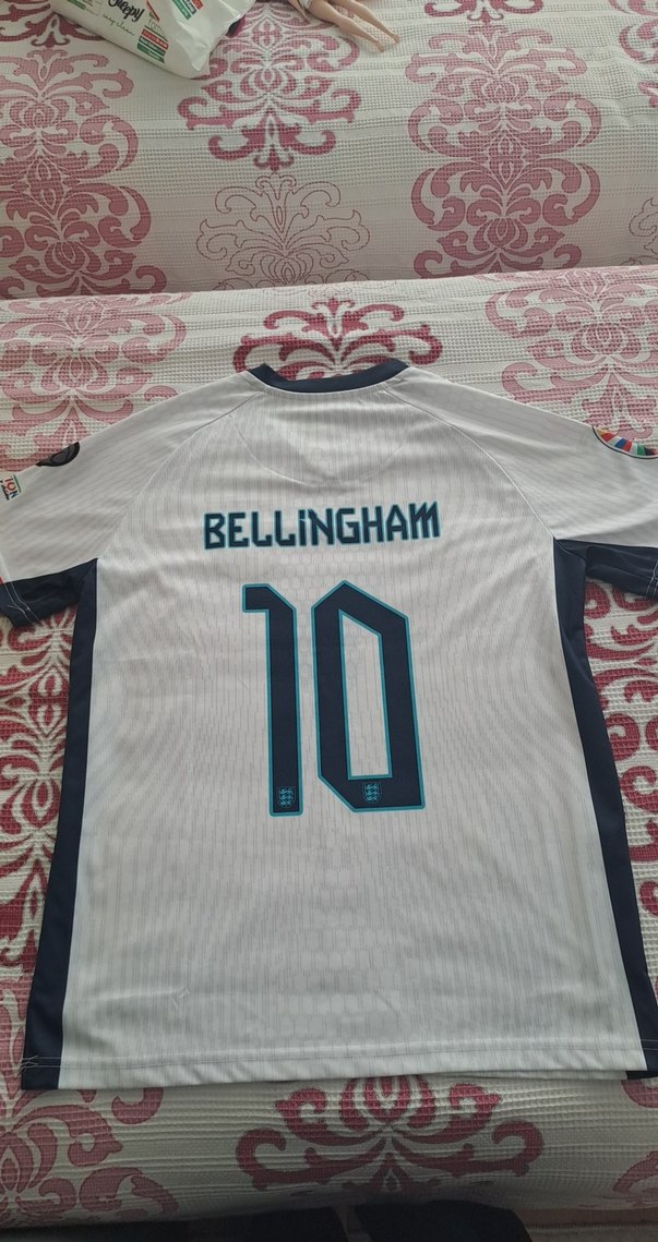 Beyaz, kısa kollu, bisiklet yaka, Bellingham baskılı erkek veya kadın spor tişörtü. Sentetik kumaştan, spor ve streetwear tarzına uygun. ⚽