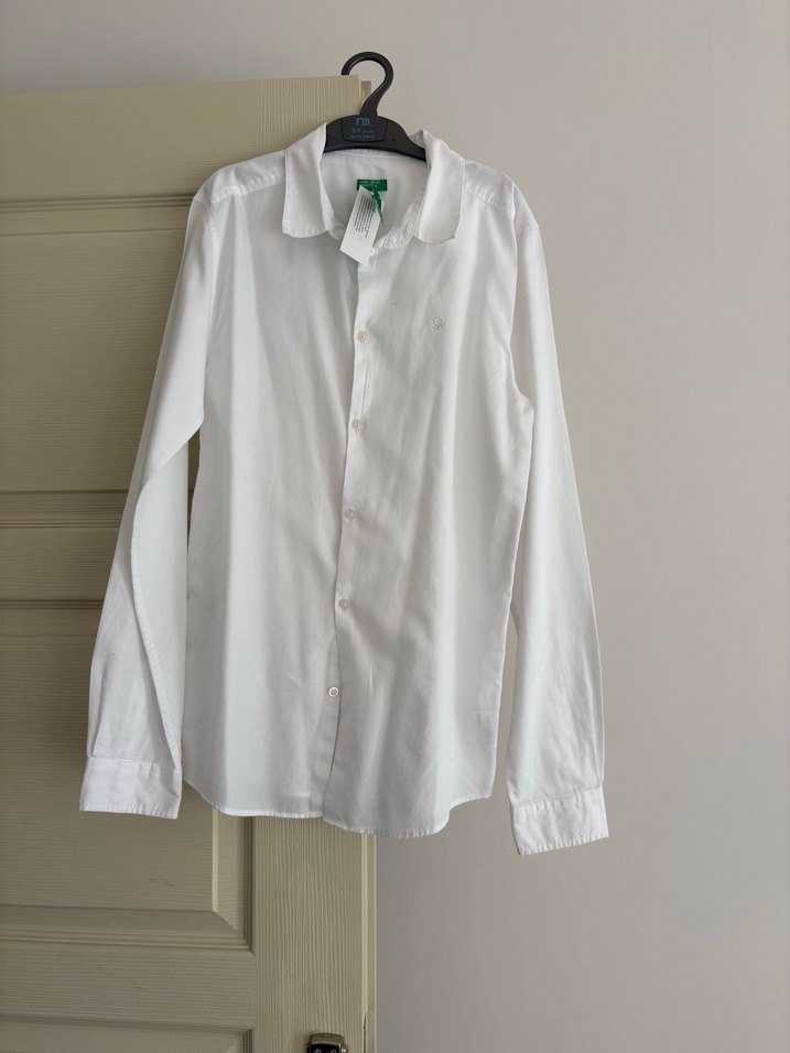 Beyaz gömlek. Benetton’dan alındı. Yepyeni hiç bir sorunu yok. İki koltuk altı arası 45 cm. Boyu 66 cm 13-14 yaş etiket bedeni