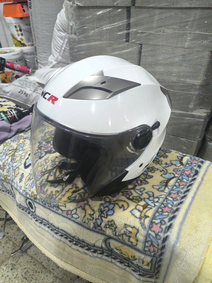 Beyaz renkli, baskılı desenli plastik malzemeden yapılmış biker motosiklet kaskı. Şeffaf vizöre ve velcro bant özelliğine sahiptir. Minimalist ve rock punk tarzına uygundur. ️