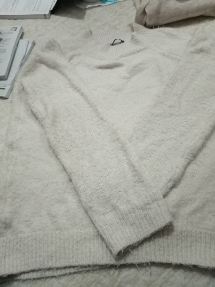Beyaz, bisiklet yaka, uzun kollu, bol kesim, yumuşak örgü kumaştan yapılmış rahat kadın kazak. Günlük kullanıma uygun, desen içermeyen sade tasarım.
