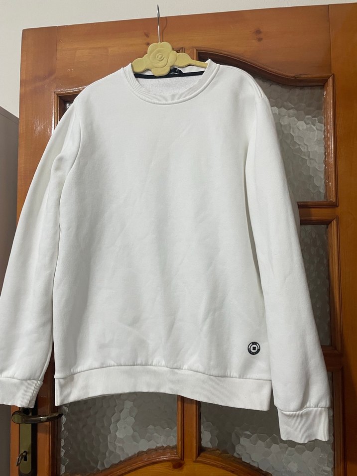 Yumuşak ve sıcak kumaştan, uzun kollu, bol kesim beyaz bisiklet yaka sweatshirt. Günlük kullanım için sade ve desensiz tasarım.