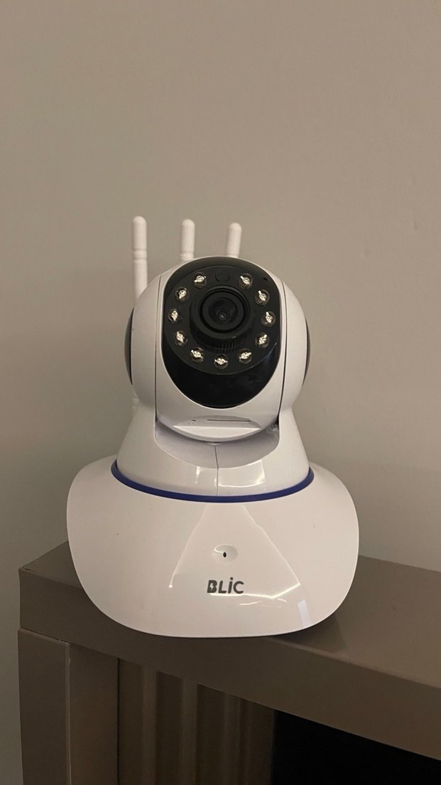 Gece görüşlü LED ışıklar ve kablosuz antenlere sahip beyaz BLiC video kamera. Kompakt ve modern tasarım.