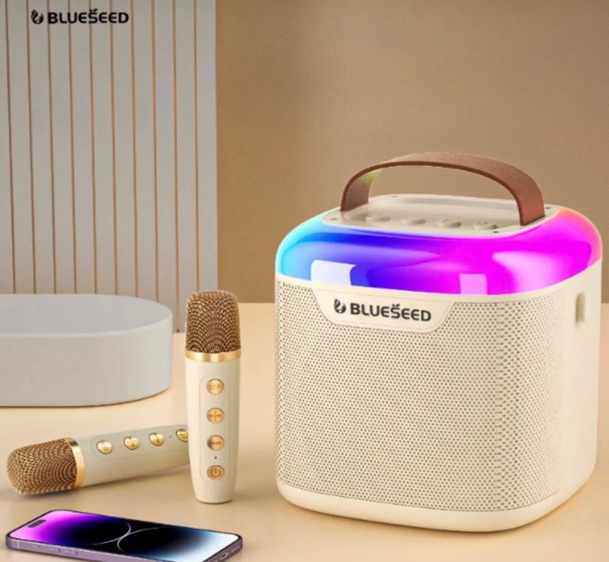 Renkli ışık efektli beyaz BlueSeed Bluetooth hoparlör ve uyumlu mikrofon, kullanışlı düğmeler ve deri kulplu tasarım.