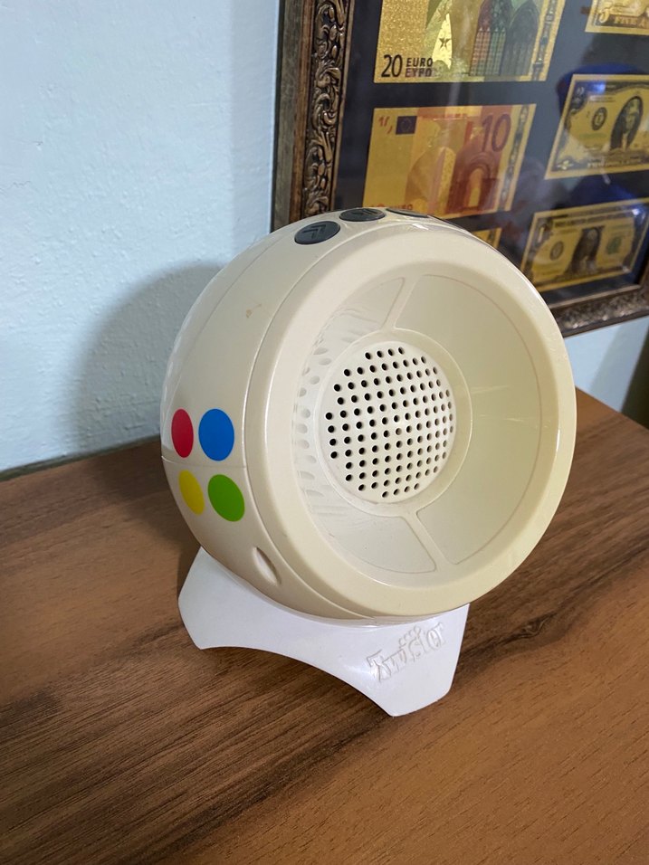 Yuvarlak tasarımlı beyaz Bluetooth hoparlör, renkli düğmelerle. Kablosuz müzik dinlemek için uygun.