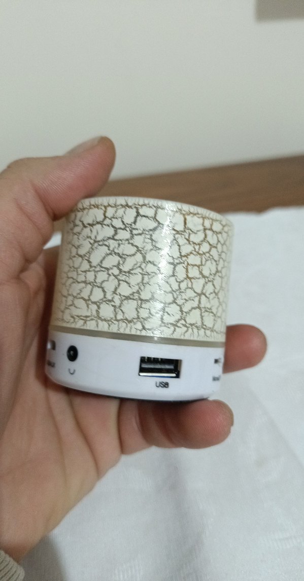 USB portu ve dokulu yüzeyi olan kompakt beyaz Bluetooth hoparlör. Kablosuz müzik için taşınabilir ve kullanışlıdır.