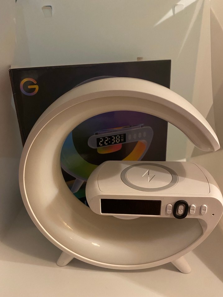 Beyaz renkli, modern kıvrımlı tasarıma sahip Bluetooth hoparlör ve 22:38 saat gösteren dijital ekran. Kompakt ve şık tasarım.