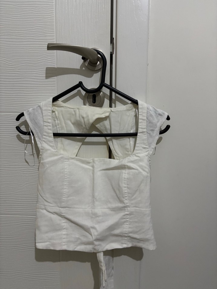 Beyaz renkte, kısa ve vücuda oturan bluz. Desensiz ve sade tasarıma sahiptir.