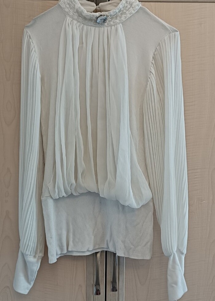 Yaka kısmı taş detaylı beyaz bluz ön kısmı tül kolları da tül detaylıdır sırt kısmında ufak bir leke vardır yıkayınca geçecektir