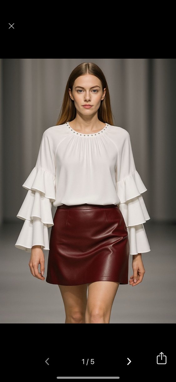 Beyaz bluz, uzun katlı fırfır kollara ve yuvarlak yaka ile bol kesime sahiptir, modern ofis tarzı için uygundur. ✨ s m. beden uygundur