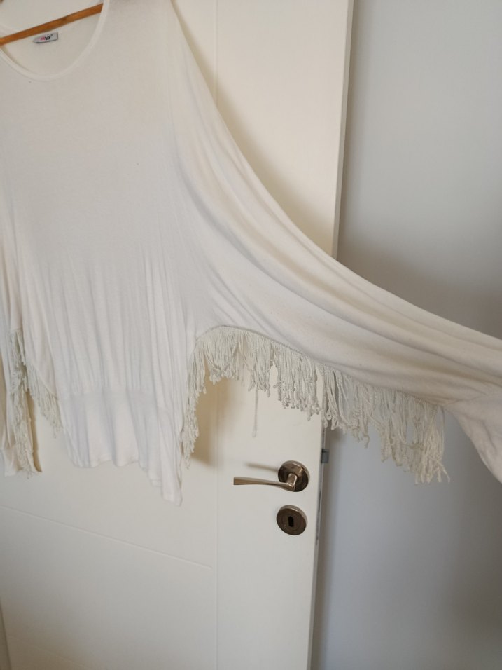 Beyaz bluz, V yaka ve dökümlü tasarıma sahiptir. Rahat kesimi, yarasa kolları günlük kullanıma uygundur. boy 79 cm