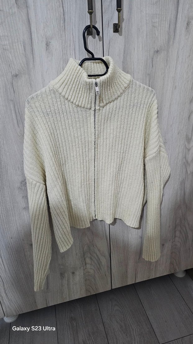Boğazlı, fermuarlı, uzun kollu beyaz kısa örgü kazak.. S Beden