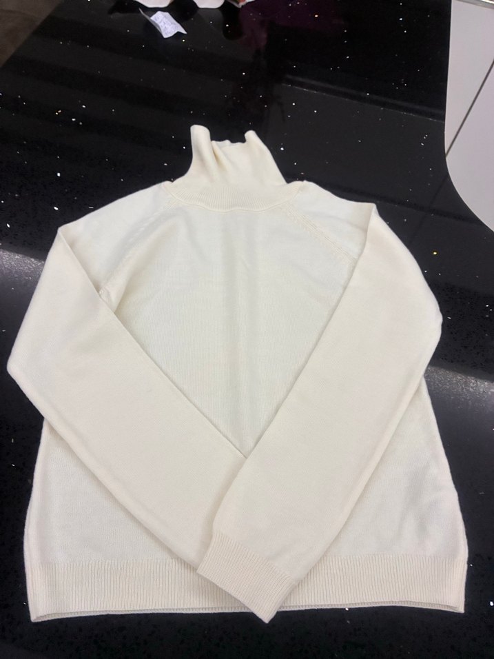 Bu beyaz kazak, boğazlı ve uzun kollu olup, yumuşak ve sıcak örgü kumaştan yapılmıştır. İnce ve vücuda oturan kesimiyle günlük rahat sokak stiline uygundur.