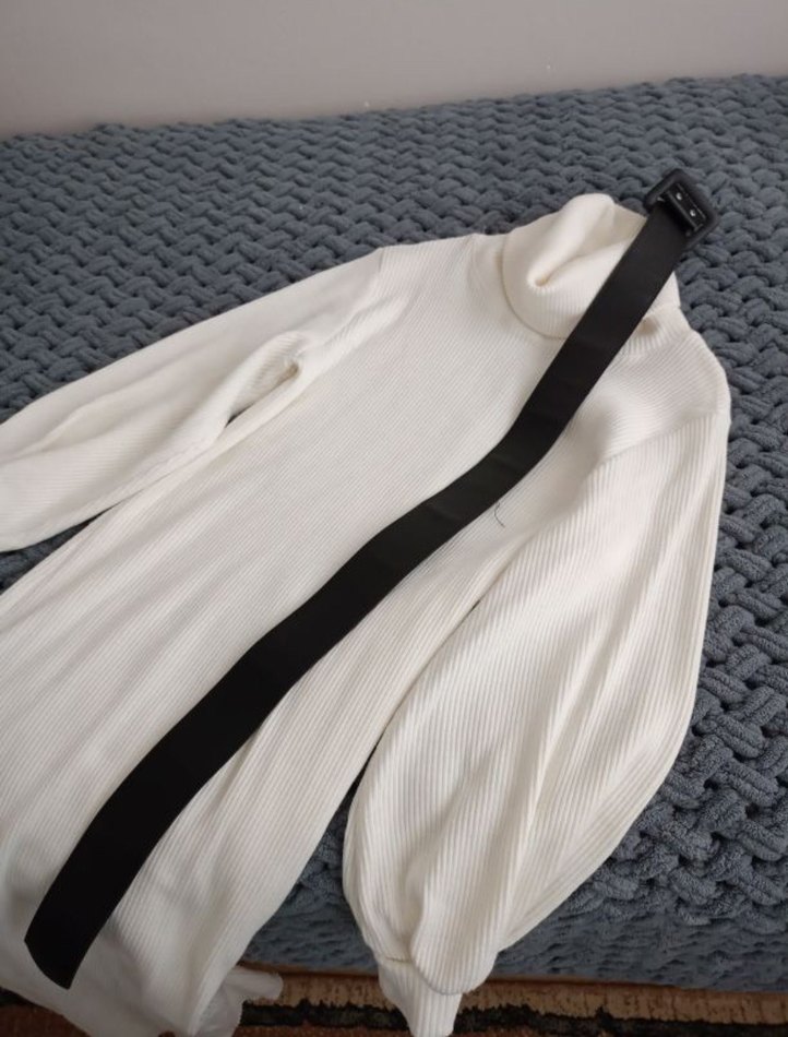 Bu uzun beyaz triko elbise , boğazlı yaka ve oturan kesime sahiptir. Kemer dahildir ve iç gösterir.
