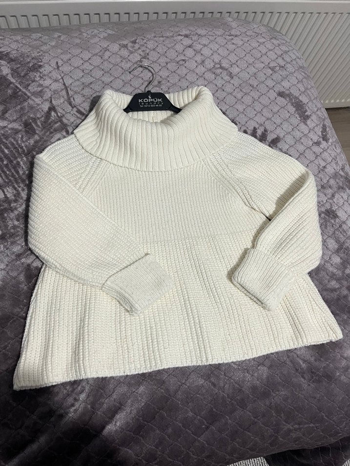 Beyaz renkli, boğazlı ve uzun kollu örgü kadın kazak. Rahat kesim ve kısa boyuyla günlük sokak stiline uygundur.