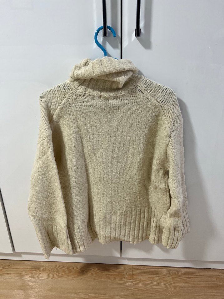 Beyaz örgü boğazlı, uzun kollu, bol kesim kadın kazak, günlük rahat kullanım için uygundur. Bi kaç kez giydim ve bi iki kez yıkandı sıcak tutan kalın bir kazak malesef olmuo yandan yırtmacı var