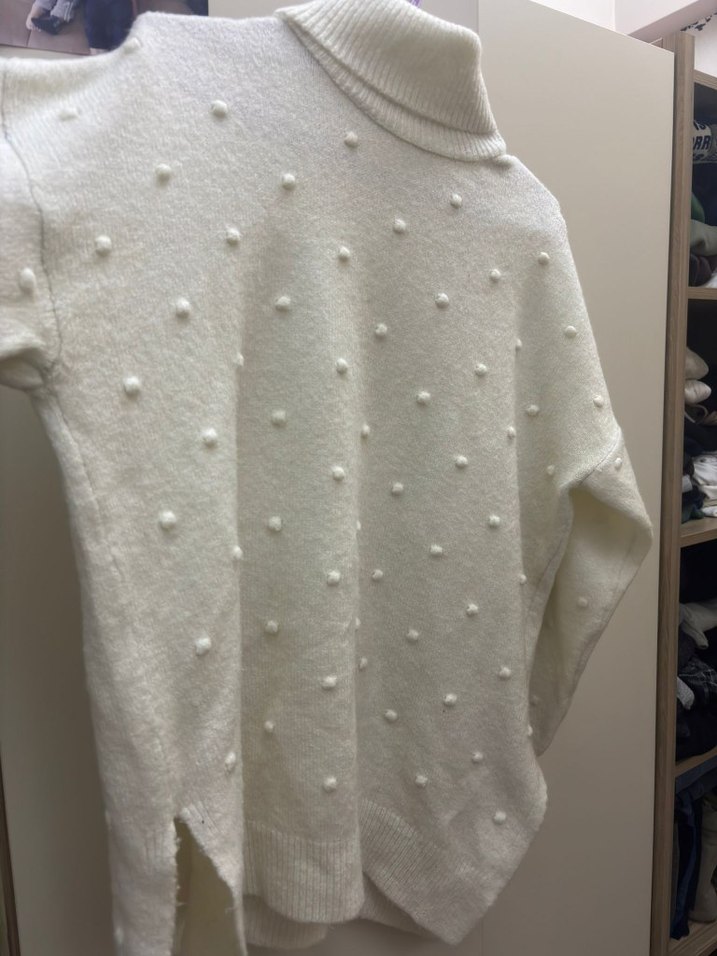 MARKASINI BİLMİYORUMMM Beyaz, boğazlı, uzun kollu, bol kesim örgü kazak. Küçük kabartmalı noktalarla rahat ve şık bir görünüm sunar.