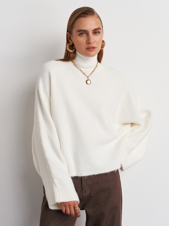 Beyaz boğazlı, uzun kollu, yumuşak yün kumaştan salaş kesim kadın kazak. Orta boy uzunluğu ve sade tasarımıyla günlük sokak modasına uyum sağlar. ❄️